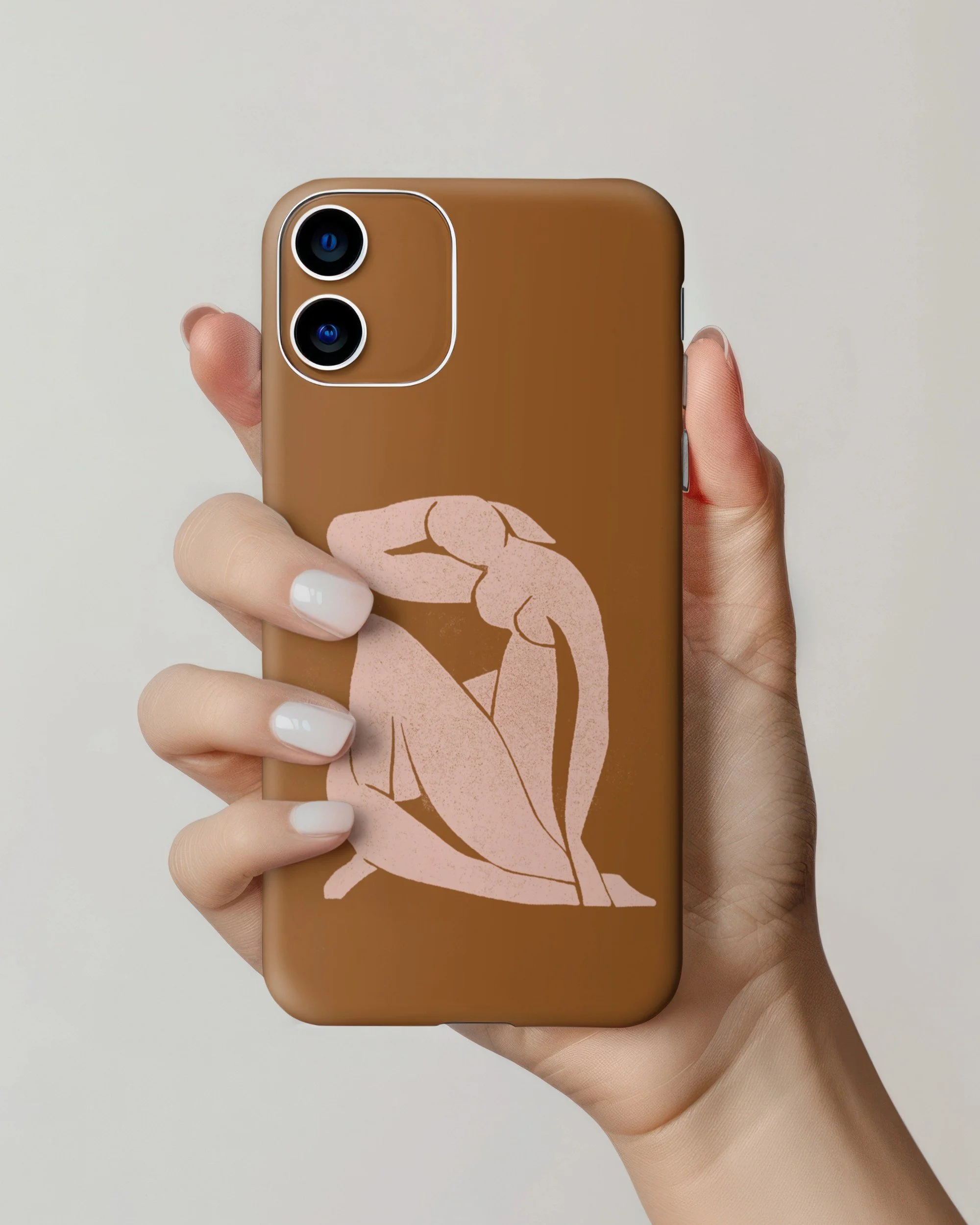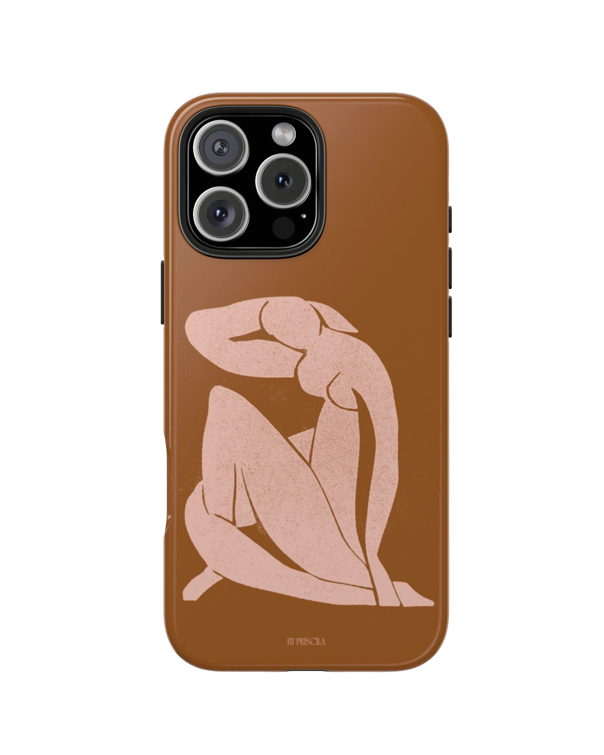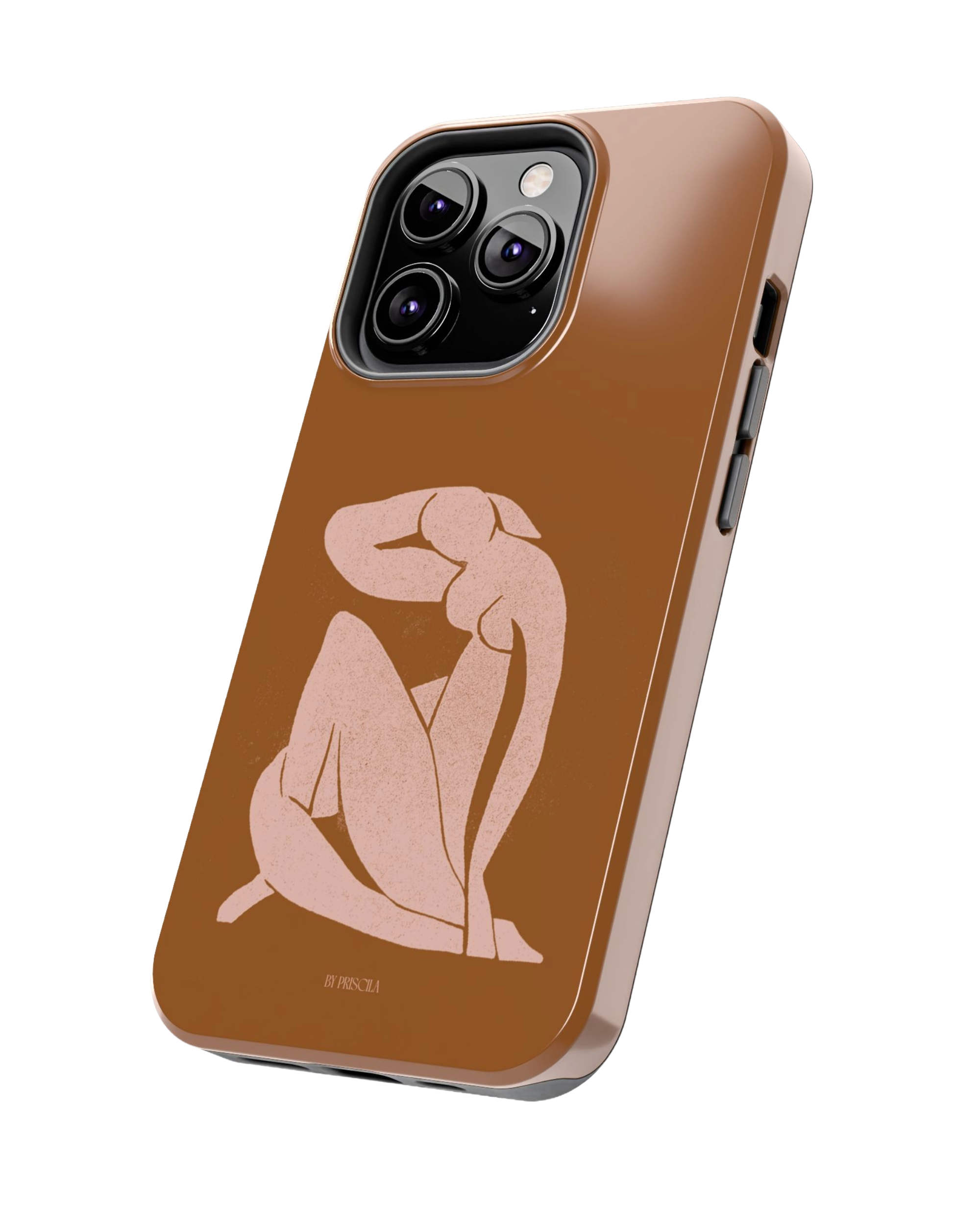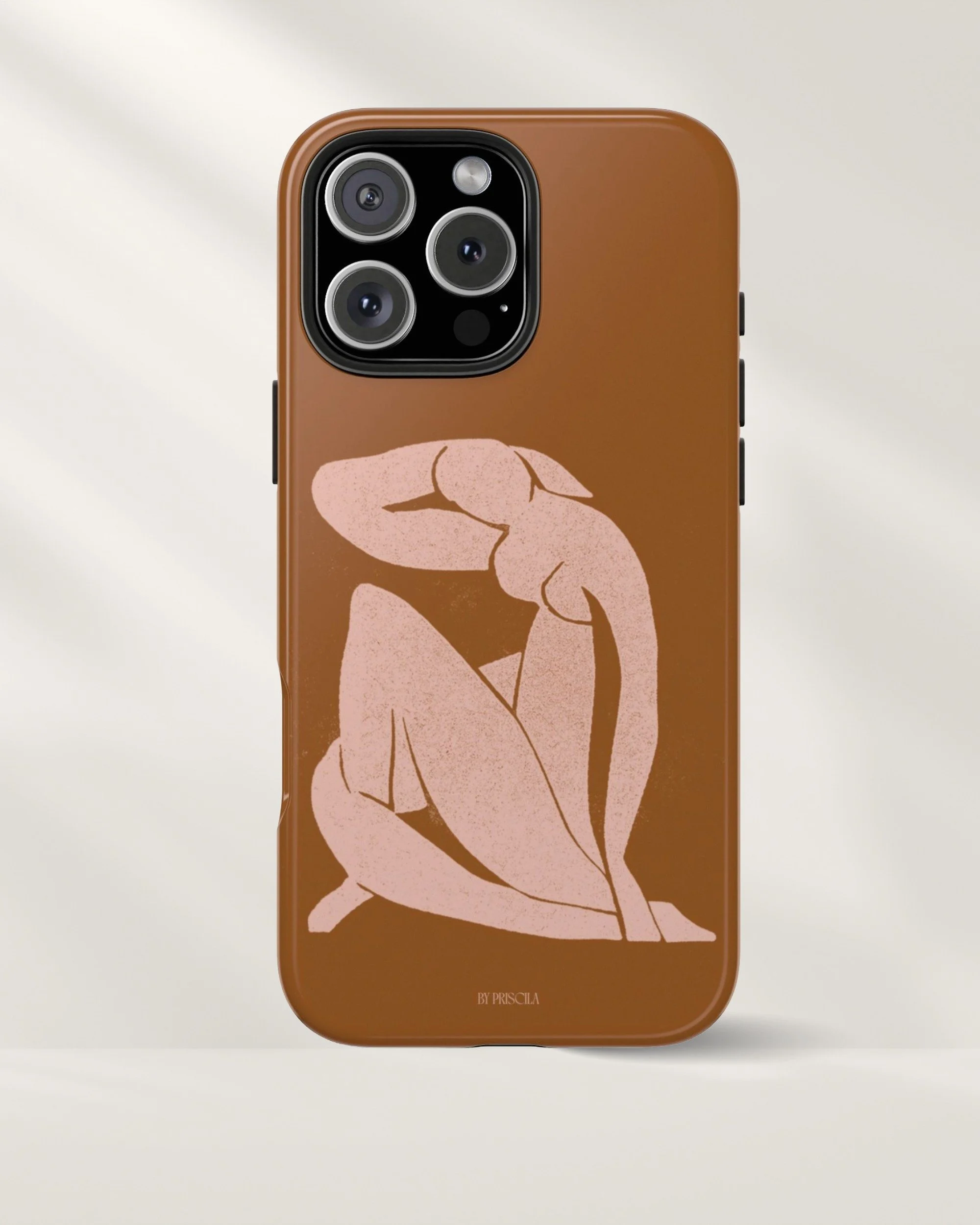 A refined blend of art and function, this phone case features a Matisse-inspired abstract female form, designed in a soft blush silhouette against a rich terracotta background. The minimal linework and organic shape composition evoke a sense of calm, femininity, and modern artistry.