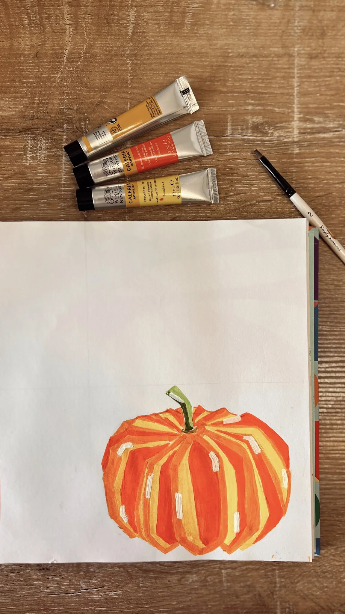 Illustration of a pumpkin on a blank page in a sketchbook with watercolor paint tubes and a pen nearby.